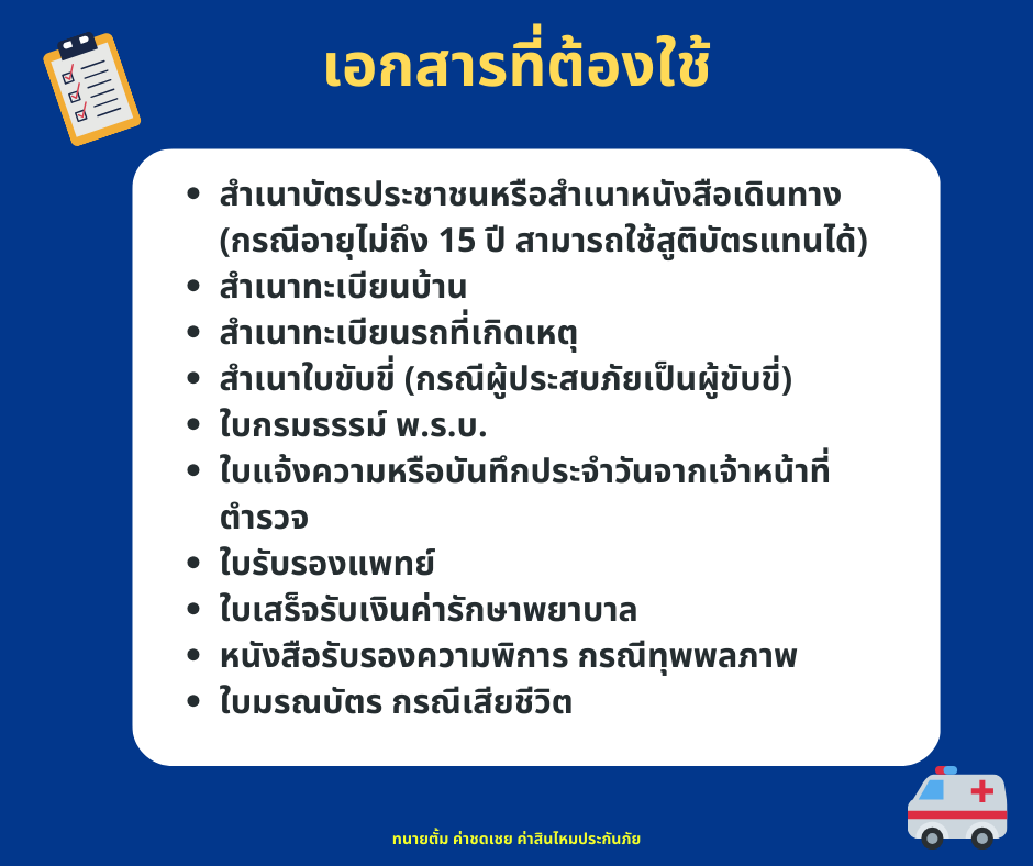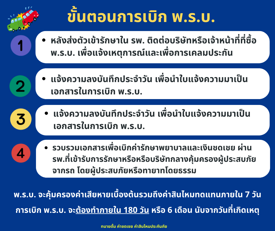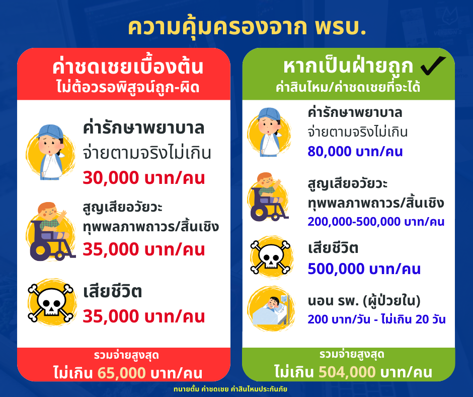 หมายเหตุ : หากผู้ขับขี่เป็นฝ่ายถูก ก็สามารถไปเรียกร้องเอาจากฝ่ายที่ต้องรับผิดได้
